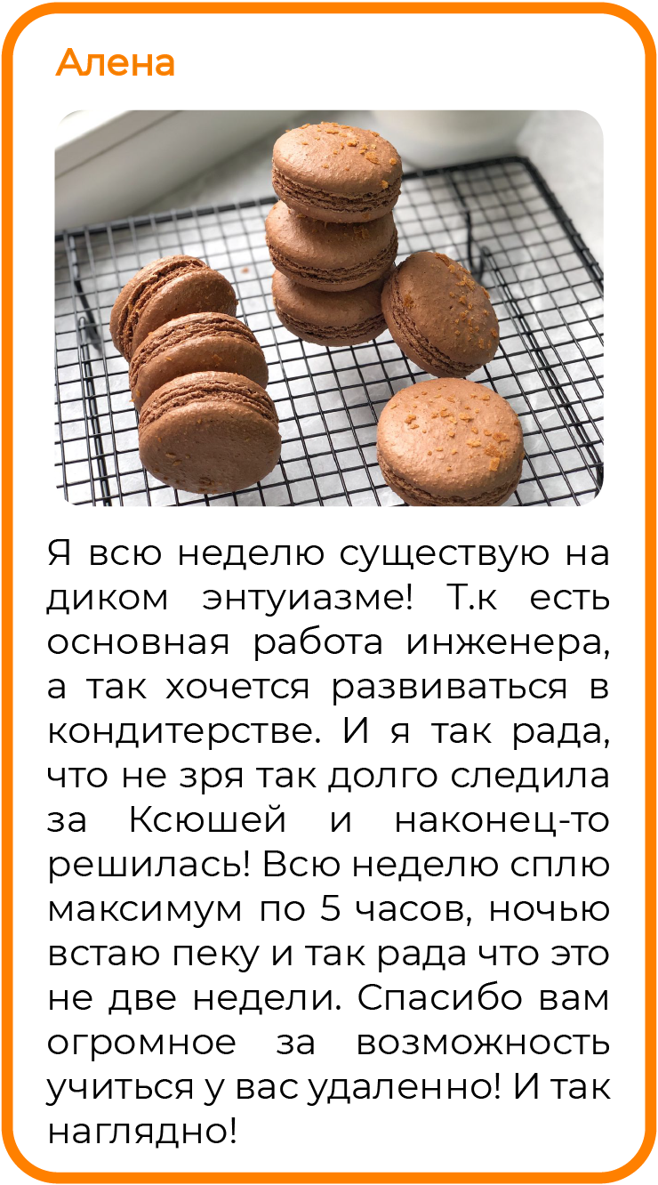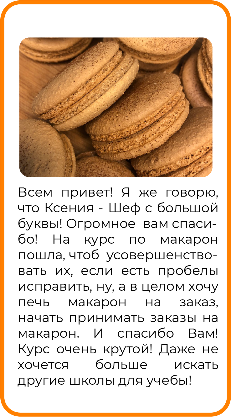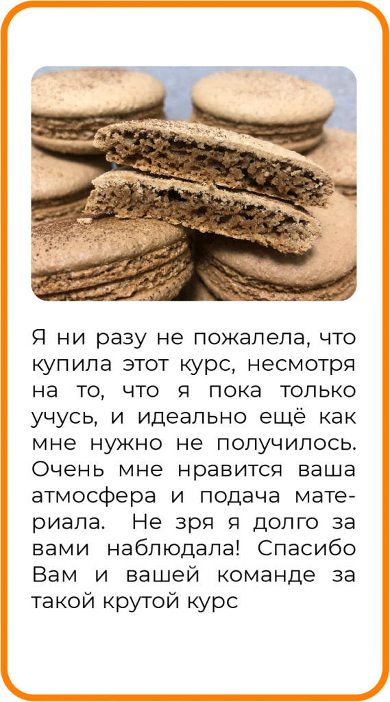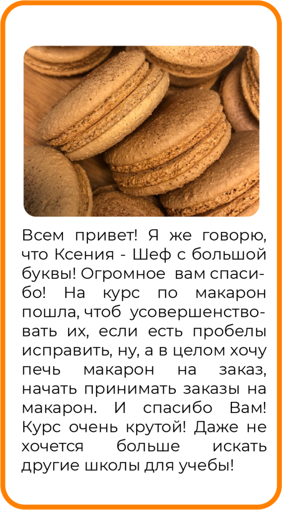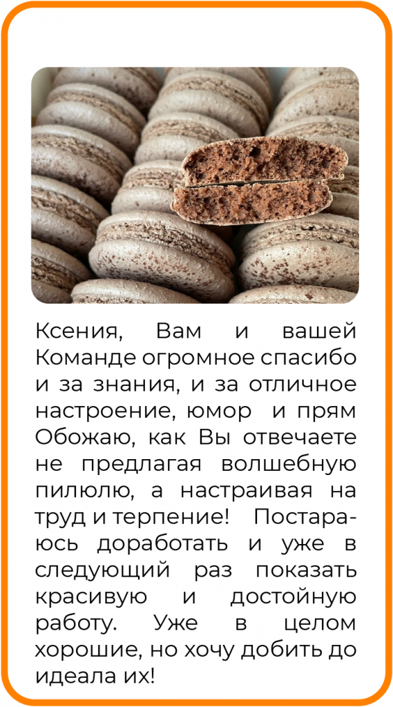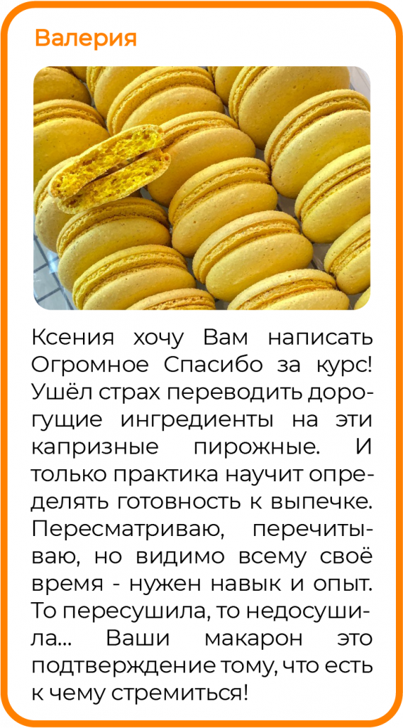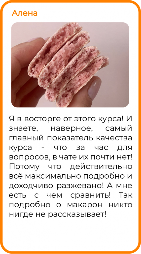 Макарон-сколько же историй и мифов летает вокруг этого десерта, а сколько страхов у кондитеров…многие даже боятся начинать! Ведь неудачных историй в интернете множество! На самом же деле в этом десерте нет абсолютно ничего сложного! Здесь, как и в любом другом десерте, важно понимание всех процессов, и когда у вас не останется ни одного вопроса, тогда вы с легкостью будете печь макарон в любой духовке и на любом ковре! На нашем курсе LE MACARON мы подробно изучаем две технологии приготовления макарон, учимся понимать процесс изнутри, понимать ошибки, видеть их и исправлять! Учимся самостоятельно создавать свои авторские вкусы, учимся готовить разные начинки, а также просто классно проводим время и находим новых друзей и единомышленников! Макарон — это десерт, который продаётся всегда! Такой десерт просто обязан быть в линейке любого успешного кондитера! Присоединяйся к нам и научись за одну неделю создавать свои идеальные макарон с нуля!