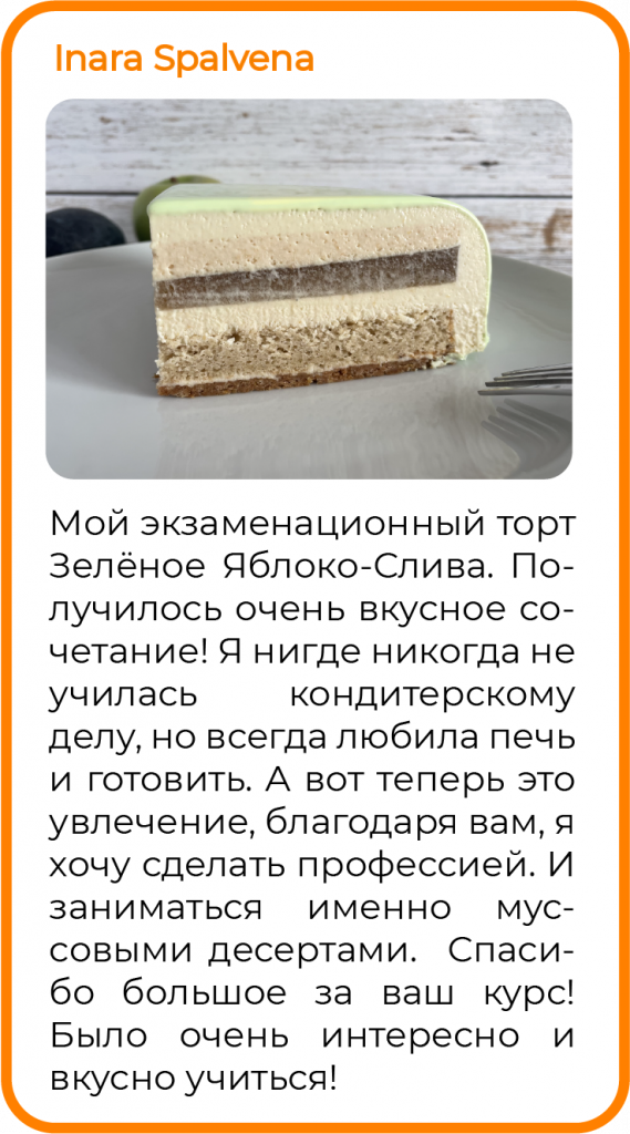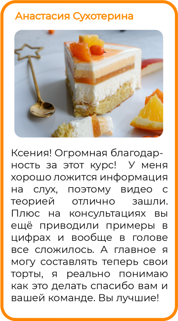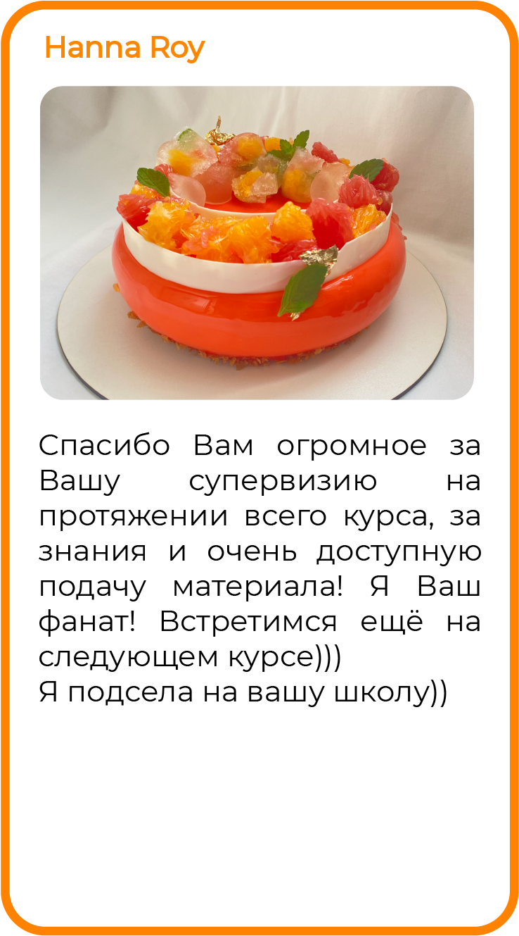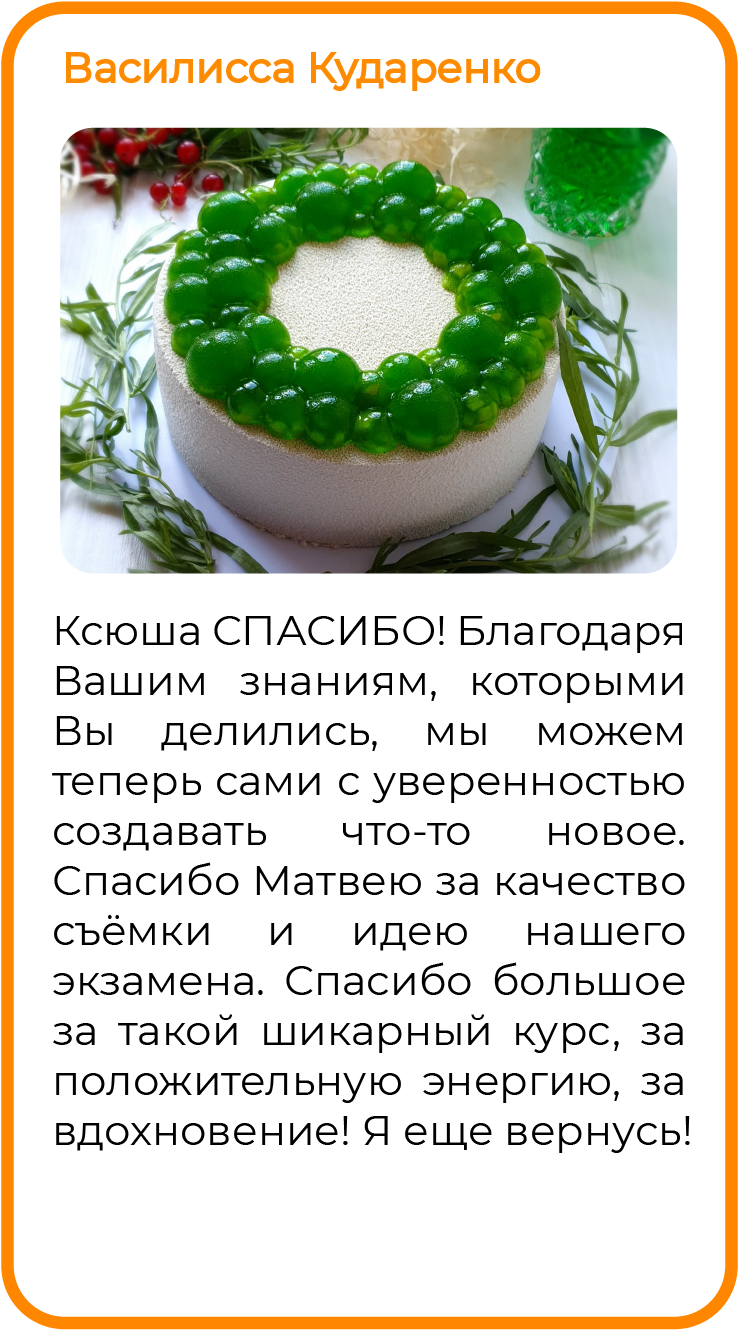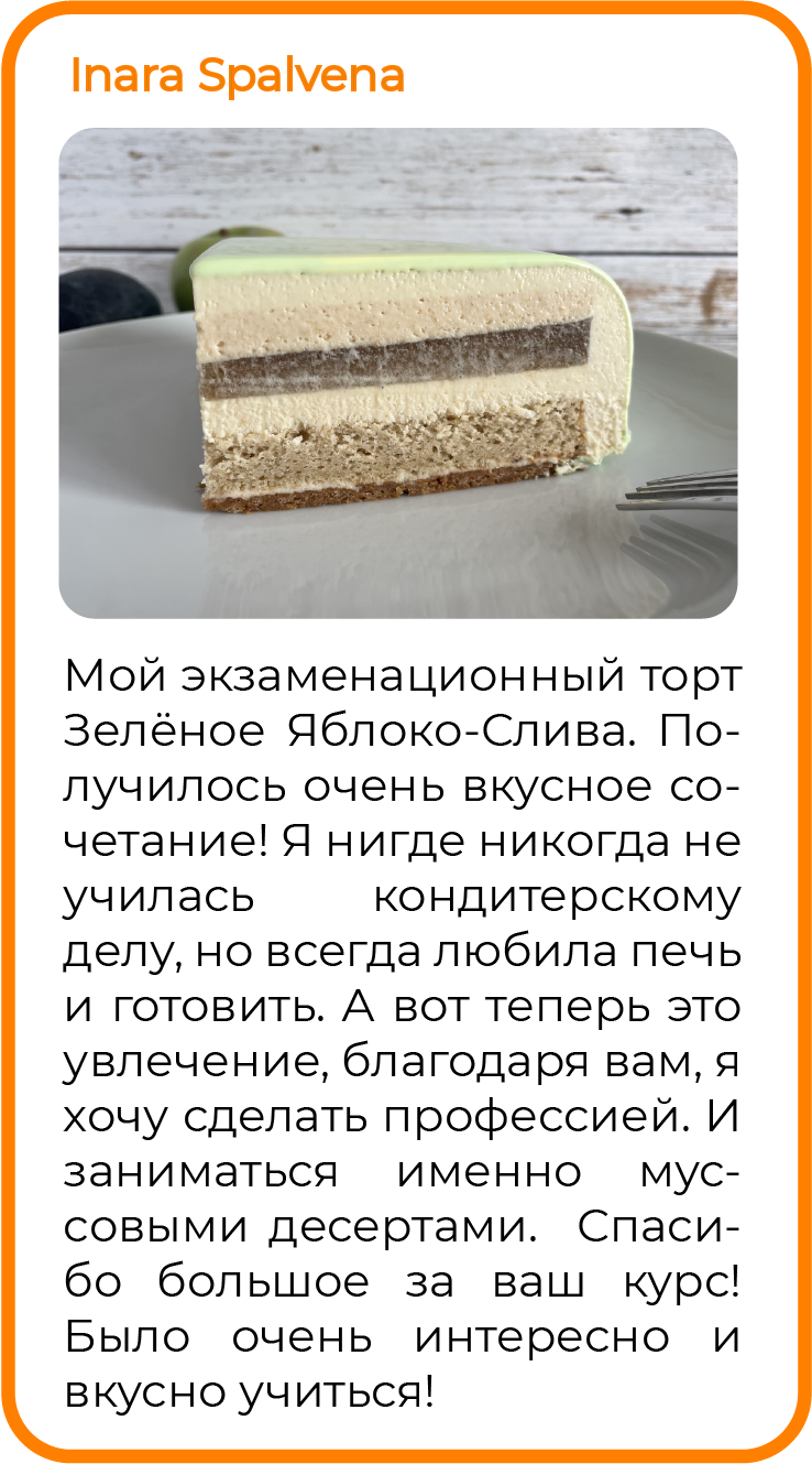 Этот курс мы хотели давно запустить, ведь огромное количество ребят хотят научиться готовить муссовые десерты с нуля. Если ты ни разу ни готовил таких десертов, но очень хочешь научиться с нуля — то этот курс для тебя. Если ты кондитер и делаешь бисквитные торты и хочешь разбавить свою линейку десертов новыми техниками и вкусами то этот курс тоже для тебя. Если ты работаешь с муссовыми тортами, но тебе не хватает вдохновение, и хочется разнообразия, новых текстур, то этот курс так же идеально подходит для тебя. Здесь мы от и до разберем мои любимые муссовые десерты, поговорим о технологиях приготовления начинок, бисквитов,муссов, научимся правильно собирать такие десерты, научимся работать с желирующими агентами, научимся пересчитывать рецепты на разные формы, научимся красиво снимать эти десерты. Научимся их понимать изнутри. После этого курса вы без труда сможете комбинировать разные текстуры и слои и создавать свои новые сочетание вкусов и текстур. После этого курса приготовление муссового торта от начала и до конца у вас будет занимать всего 1.5 часа. Мы так же подробно разберем все основные покрытия, зеркальную глазурь, велюр, эффект леопарда. В течении месяца вы будете под руководством шефа поэтапно проходить теоретические основы, готовить заготовки и начинки и потом собирать свои первые муссовые торты, вы удивитесь тому, как на простой домашней кухне можно создавать настоящие шедевры. Весь курс курируется лично шефом. Мы ждем тебя в нашу команду.