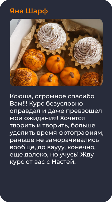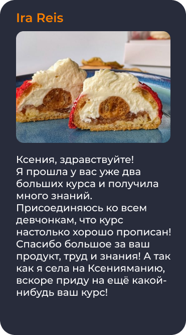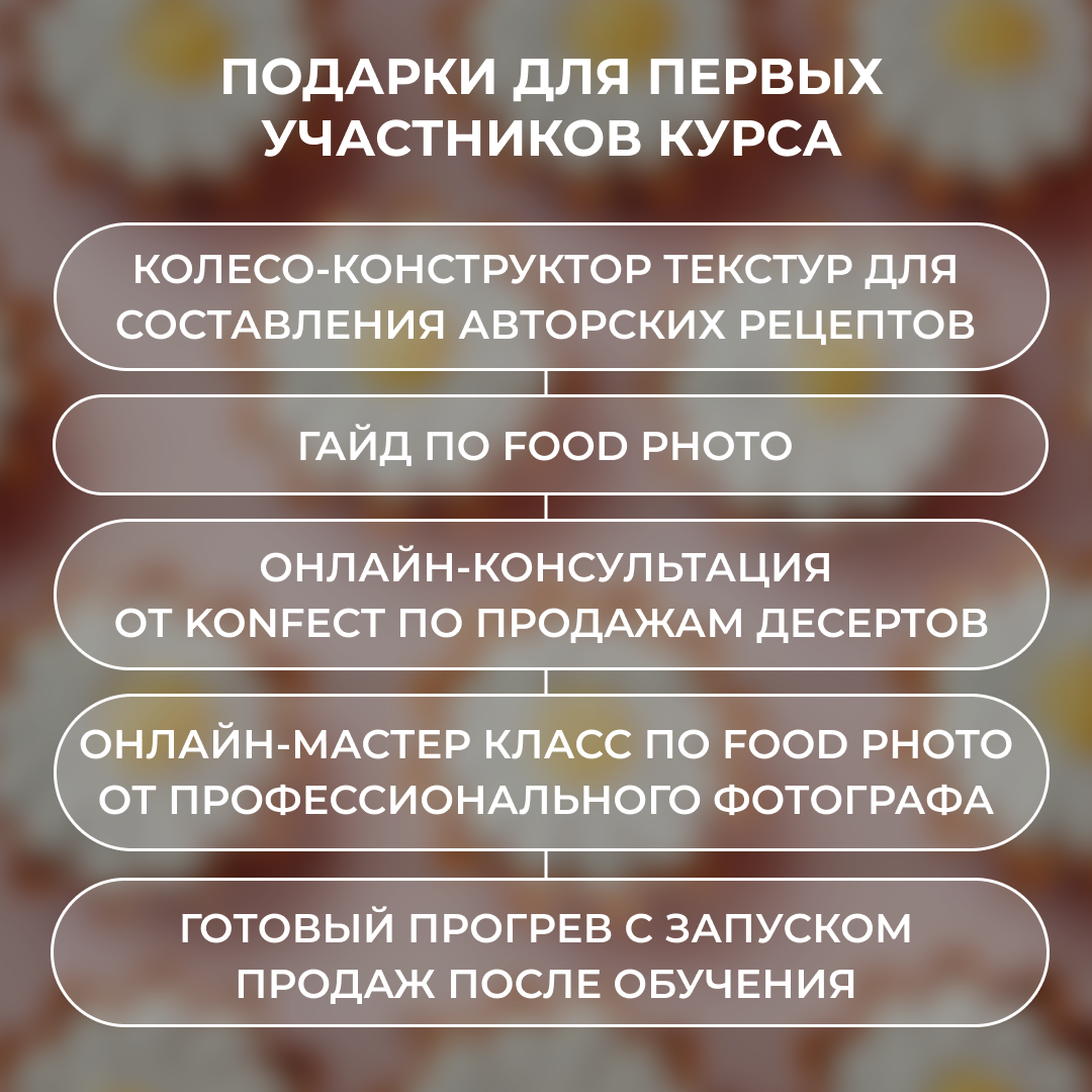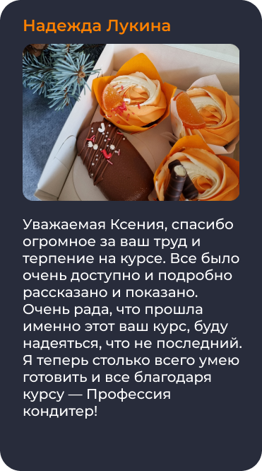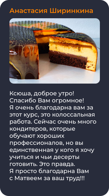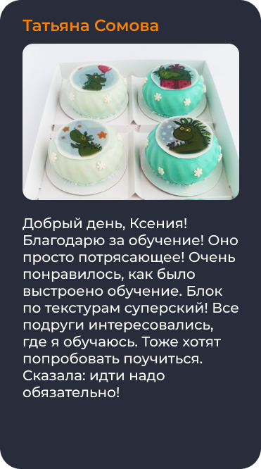 Пройдя это обучение вы сможете составлять свои авторские рецепты десертов, и с легкостью работать на заказ и зарабатывать на этом!