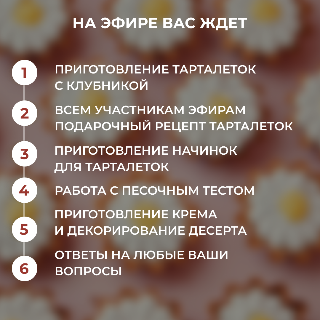 За окном уже весна, и хочется вкусных свежих десертов! На этом прямом эфире мы вместе с вами приготовим невероятно красивые хрустящие тарталетки с разными начинками, украсим их свежей сочной клубникой и сливочным кремом! Десерт готовится из максимально простых ингредиентов и занимает всего 30 мин вашего времени! Только для участников прямого эфира будет доступна подарочная рецептурная карта тарталеток с эфира!